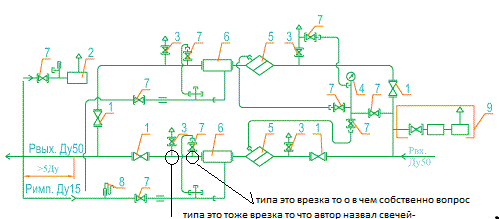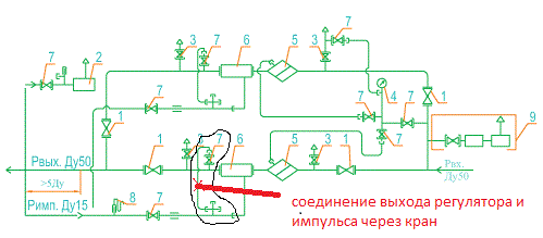 Привет Всем! Меня интересует врезка после регулятора + шаровой кран + трубопровод соединиется с импульсом. Для чего соединять выход после регулятора и импульсом. Импульсное давление отбирают на выходе после 5Ду.