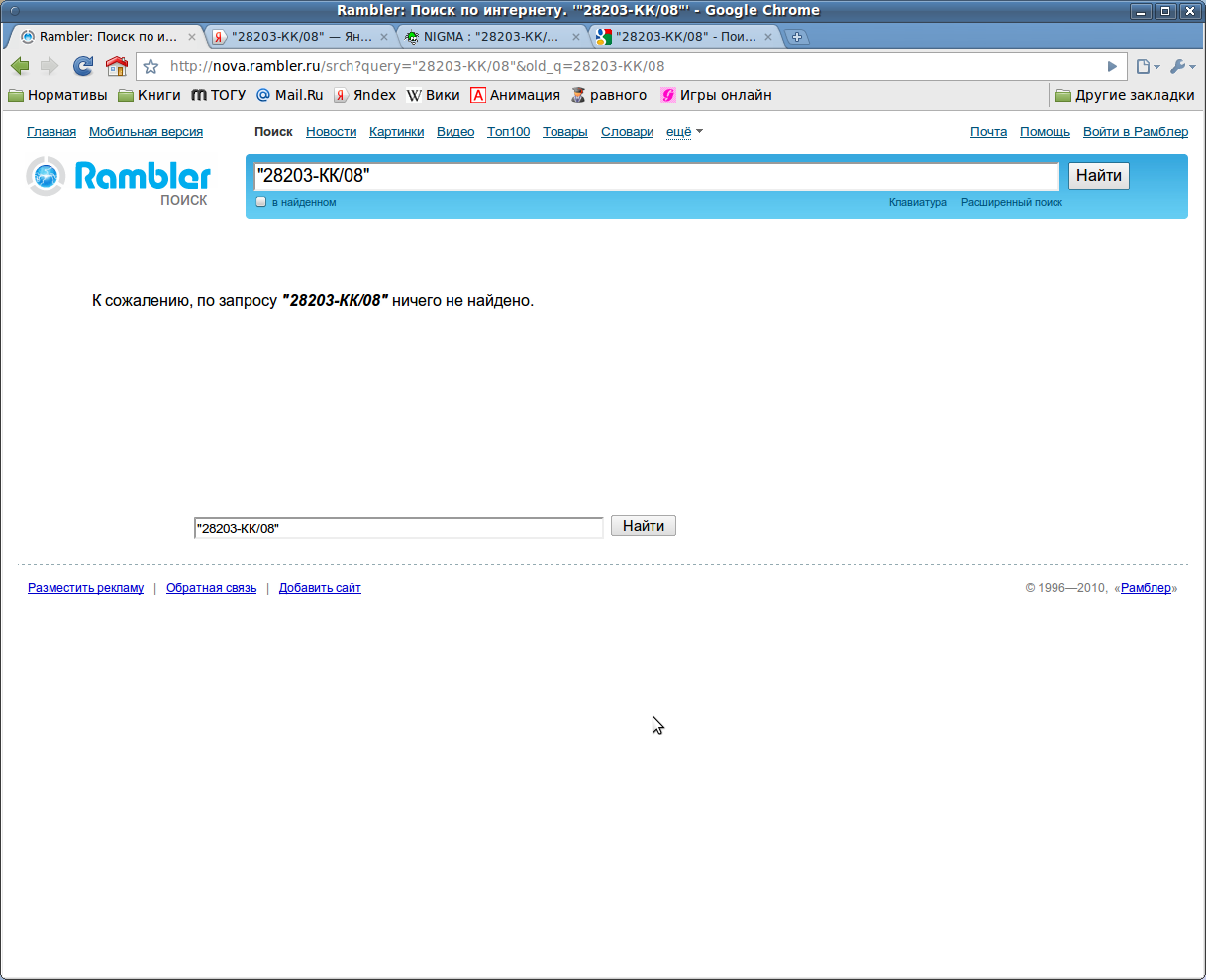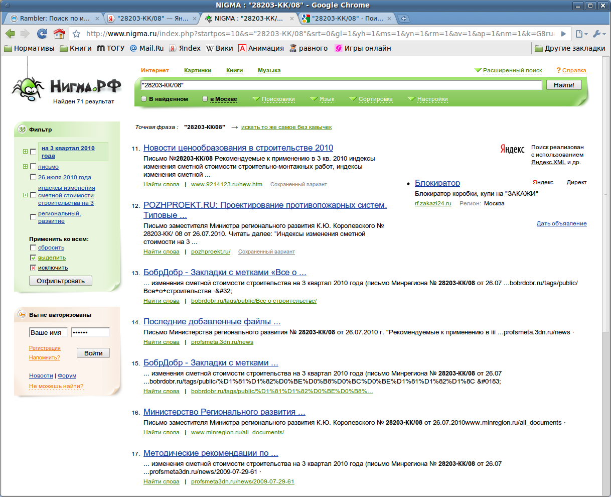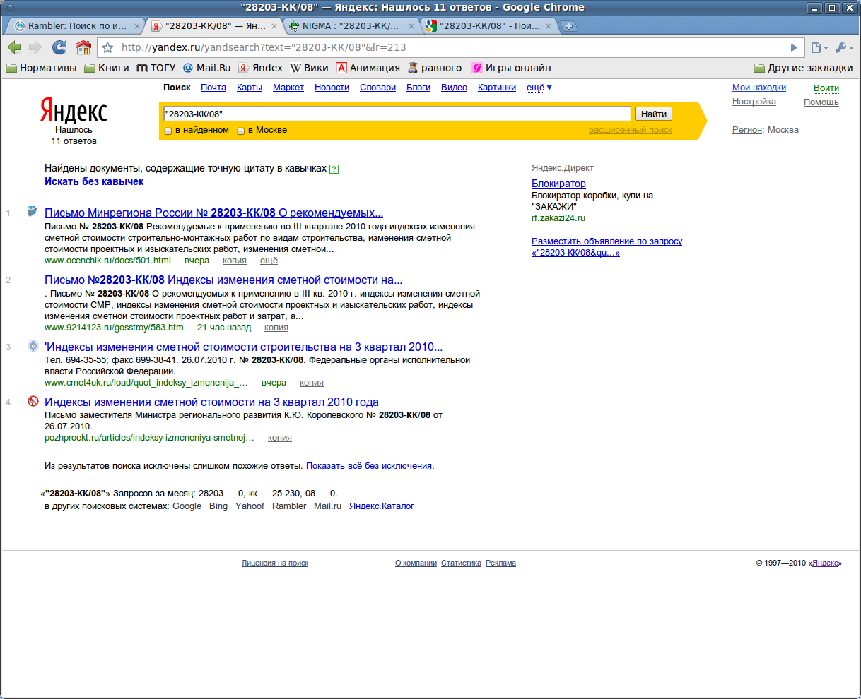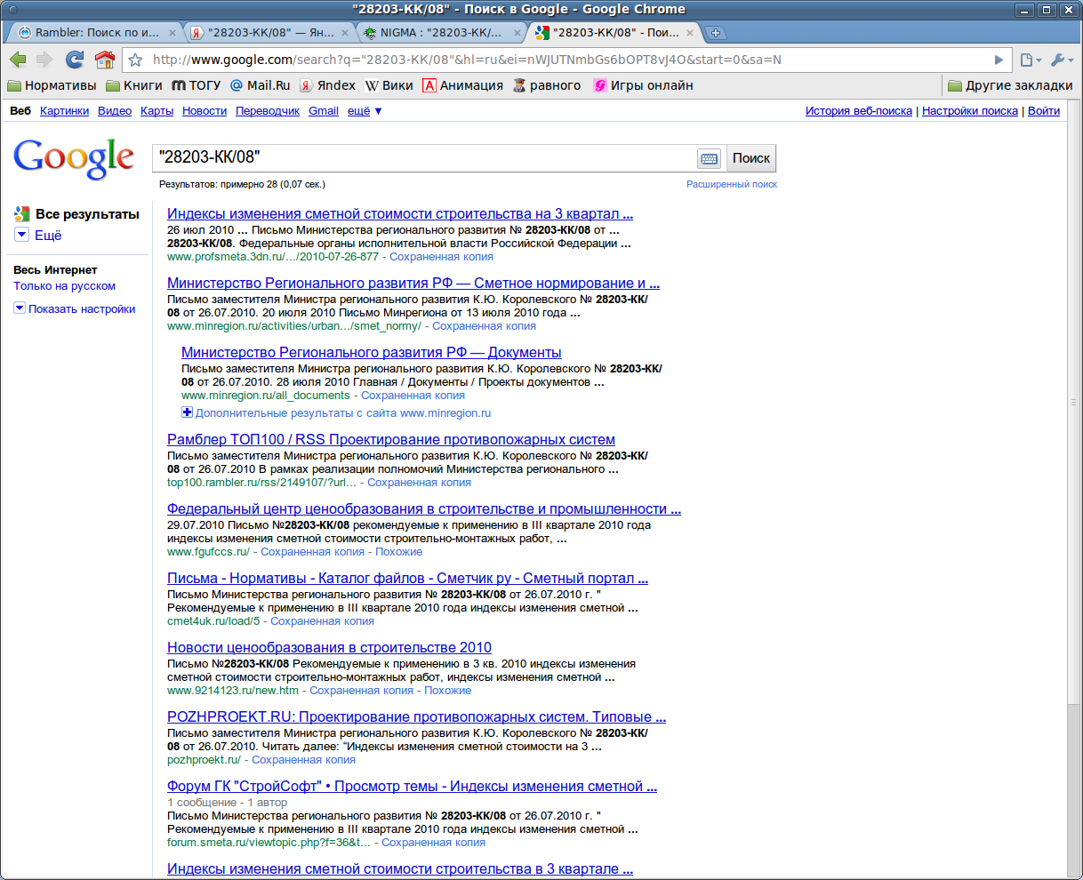 Решил протестировать поисковики на предмет оперативности включения в поисковую базу информации на веб-страничках... забил в поиск по точному совпадению "28203-КК/08" (это номер письма с индексами Минрегиона за 3 квартал, это письмо появилось в сети 4 дня назад). Вот результаты: 1. Рамблер не нашел ничего... 2. В яндексе выдало четыре ссылки... (хорошо хоть cmet4uk.ru в результатах есть , но Минрегиона и ФЦЦС нет... ) 3. В гугле 14 ссылок... 4. В нигме выдало аж 17 релевантных ссылок.. 5. ru.Yahoo.com - 7 ссылок, Маил.ру - ничего, Aport.ru - ничего, Bing.ru (он же MSN.ru) - 7 релевантных ссылки.