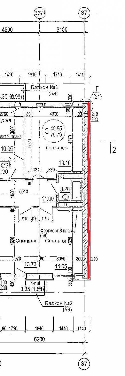 Работа в местах, о которых я говорю, невозможна без применения этих самых люлек (пусть будут площадки, не важно). Посмотрите сами (красным выделила это место - самый краешек плиты перекрытия за монолитной сплошной стеной).