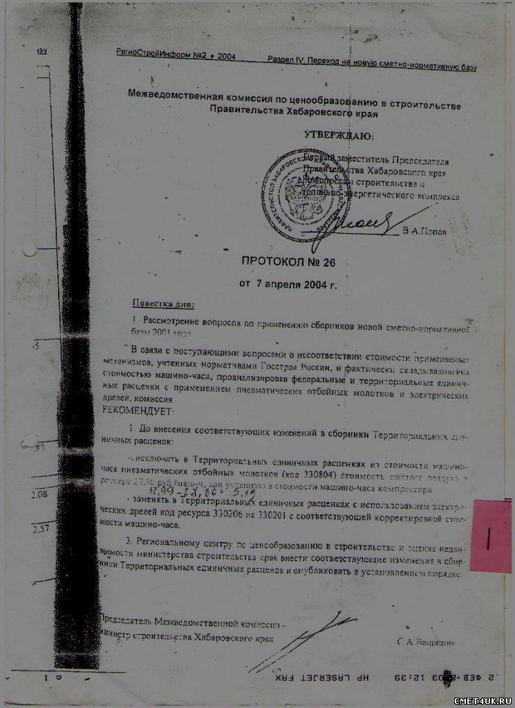 Здравствуйте, уважаемые!! Вопрос, возможно, больше к Дальневосточникам, т.к. руководствуюсь я Протоколом № 6 от 07 апреля 2004г. Межведомственной комиссии по ценообразованию в строительстве Правительства Хабаровского края... Но, может быть, в других регионах тоже есть что-то подобное .. Непосредственно, вопрос.. До настоящего времени проверяющие органы легкой рукой вычеркивают стоимость сжатого воздуха из тех расценок, где применяются молотки отбойные .. Но, в настоящем протоколе от 2004 года есть п.3. (кратко) ".. РЦЦС края внести изменения в сборники ТЕР и опубликовать в установленном порядке.." Так вот, кто-нибудь знает в базе 2009 года этот пункт наконец-то учли или мы по прежнему продолжаем вычеркивать сжатый воздух??? PS. Документ прилагаю... За качество извините, но то что есть .. практически Раритет )))