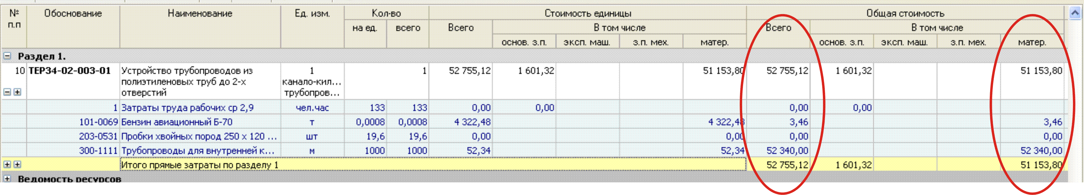 Почему стоимость материала "Трубопроводы для внутренней канализации из полиэтиленовых труб отечественного производства, диаметром 100 мм" в данной позиции = 52,34 за 1 метр, а в столбце "Общая стоимость" "материалы" цена 1 метра = 51,1538 это с учетом бензина