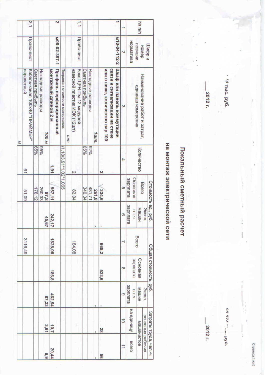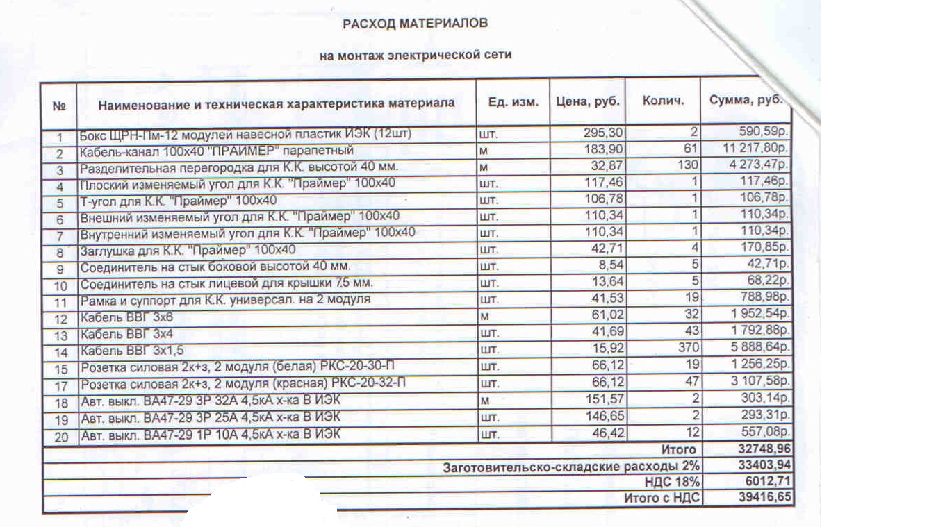 Это ж не смета, а Расход материалов на монтаж электрической сети. Кабель какой-то странный – в штуках, а автоматический выключатель – в метрах??. Можно добавить транспортные расходы по доставке этих материалов на строительную площадку.
