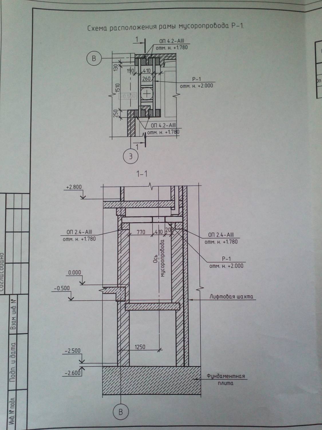 все верно по 8-6-1-1, читаю состав работ, вроде как не сидит установка рамы: "Установка вертикального ствола мусоропровода из хризотилцементных труб диаметром 400 мм с надвижными муфтами, креплением ствола в пределах этажей и нижней части ствола к стальной опорной раме.", я так понимаю просто крепление ствола к стальной опорной раме, но нет установки самой рамы... Прикрепляю чертеж.