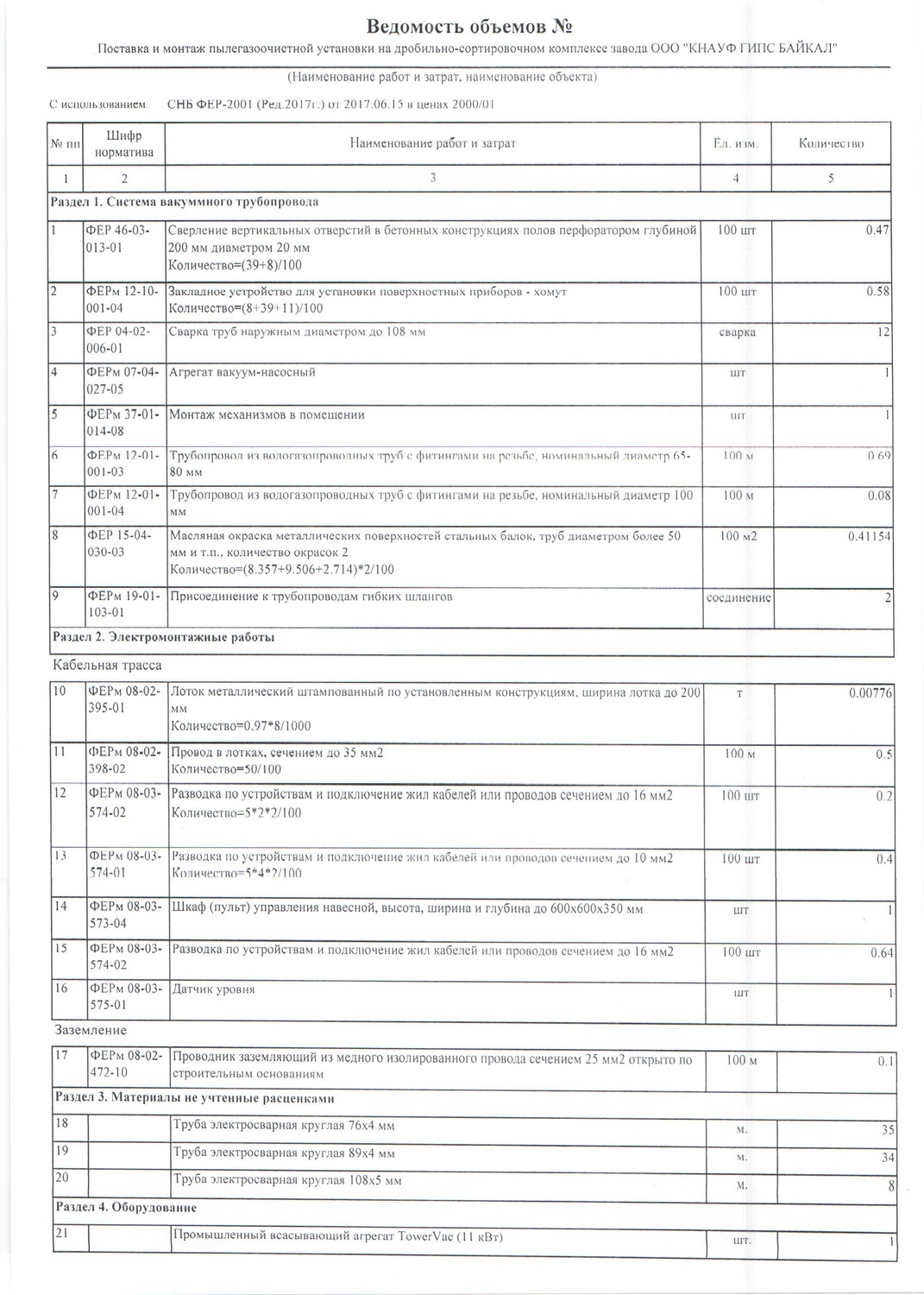 Всем доброго дня, Кто-нибудь сталкивался с монтажом промышленного всасывающего агрегата с вакуумными трубопроводами для уборки цеха? Мне нужно выйти на конечную сумму - 1900 тыс.руб, пока вышло со всеми работами 900 тыс.руб, со всеми монтажными и пусконаладочными работами, плюс разные коэффициенты,... Помогите пожалуйста советом, в поиске кажется все перебрала, не могу найти подобное, заранее спасибо