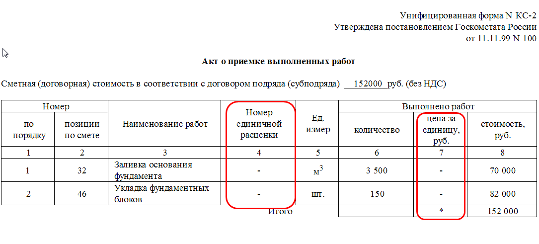 "...не заполняются (гр. 4 "Номер единичной расценки" и гр. 7 "Выполнено работ; цена за единицу, руб."), в них проставляется прочерк."