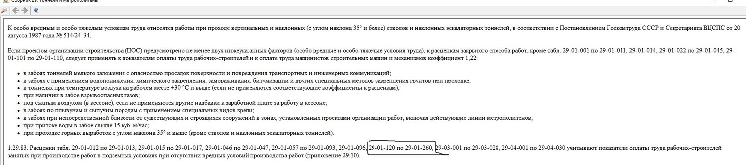 Открываем любую расценку из этого списка. например 29-01-198-07, соответствующую ТЧ п.29.1.83 как подземная, смотрим на сайте минстроя в  файле ПДФ http://www.minstroyrf.ru/trades/view.state-fer.php?sphrase_id=325068 , и в базе программы Смета ру. Средний разряд 4.7  Трудозатраты 133 чел/ч ОЗП 1416,45   1416,45/133=10,65 что соответствует базовой тарифной ставке без учета осложняющих. В таблице 29,10 базовый тариф 17,89 для этого разряда. Те 10,65*1,68= 17.89 Иными словами расценка не учитывает повышающий коэффициент к ставке оплаты труда для подземных условий.  Все документы можно посмотреть во вложенных файлах.