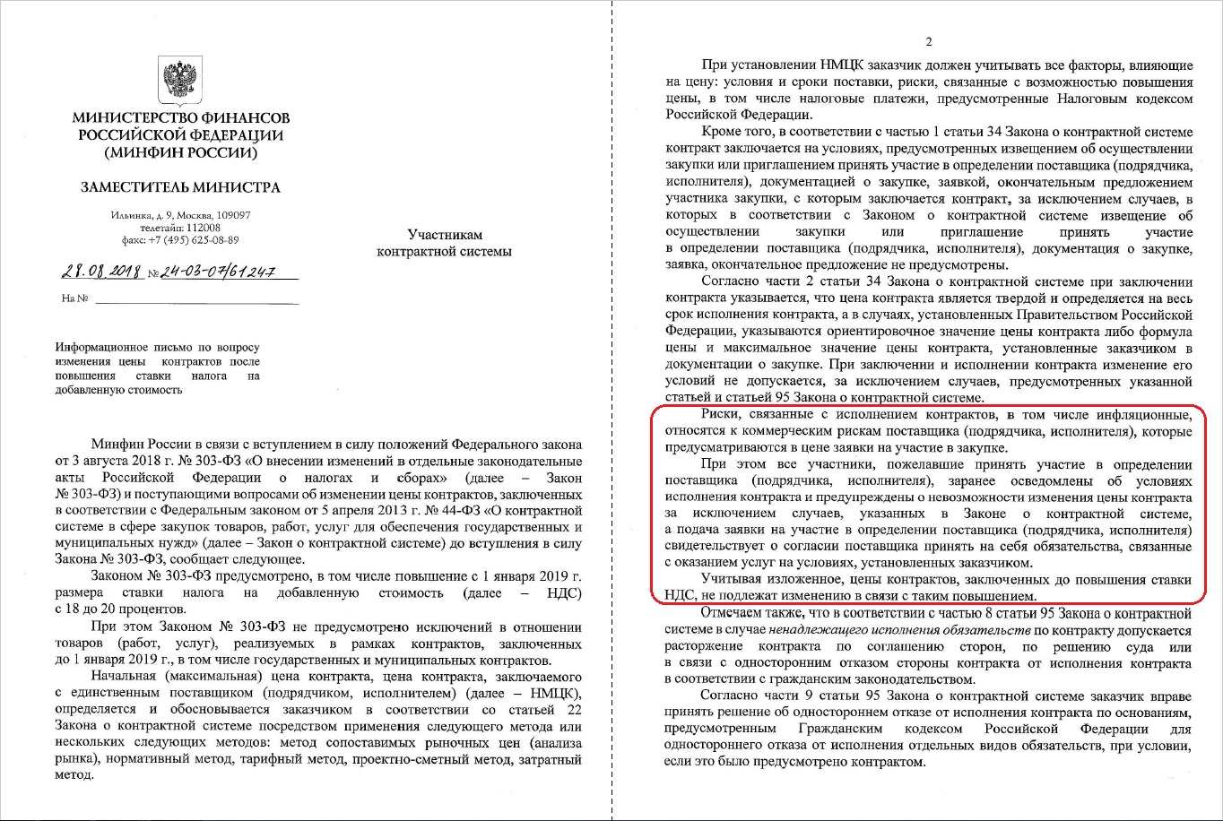 по вопросу изменения цены контрактов, заключенных в соответствии с Федеральным законом от 18.07.2011 № 223-ФЗ «О закупках товаров, работ, услуг отдельными видами юридических лиц», после повышения ставки налога на добавленную стоимость