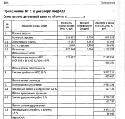 На стр. 454 рассматривается приложение к договору. Вопрос: почему к ЗПМ применен индекс ЗП а не к ЭМ? и почему в ИТОГО просуммированна ЗПМ если она указана как в т.ч. и следовательно уже учтена в ЭМ?