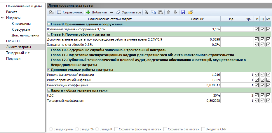 Указываю лимитированные затраты (работы в зимнее время, индексы-дефляторы от заказчика и пр.)