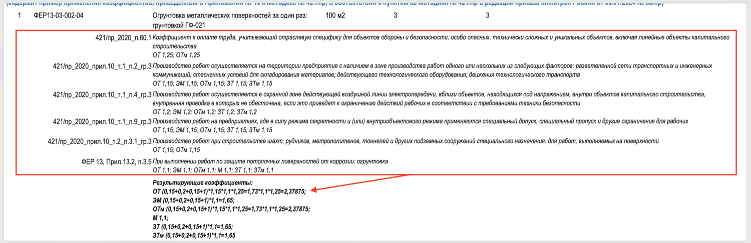 Смотрю пример сметы по 421 методике БИ методом по элементам затрат https://fgiscs.minstroyrf.ru/frsn....b4744bb где к первой позиции применены несколько коэффициентов. На примере ОТ результирующий расчет коэффициента такой: