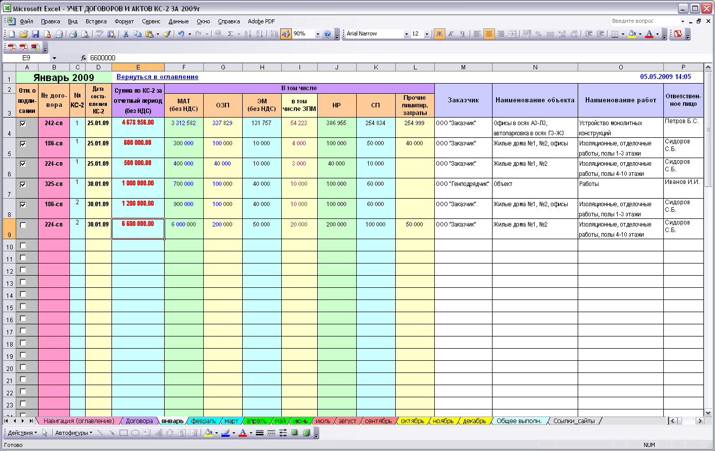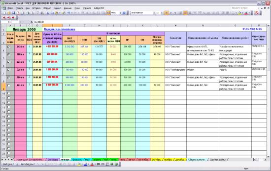 Почему-то у меня на экране не все видно. Например, страница Договора - последний "видимый" столбец это "выполнено с начала года (без НДС). Страница "по месяцам" - последнее, что читается, это столбец с наименованием Заказчика.