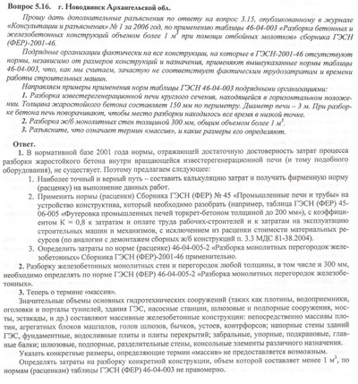 Прошу дать дополнительные разъяснения по ответу на вопрос 3.15, опубликованному в журнале «Консультации и разъяснения» № 1 за 2006 год, по применению таблицы 46-04-003 «Разборка бетонных и железобетонных конструкций объемом более 1 м3 при помощи отбойных молотков» сборника ГЭСН (ФЕР)-2001-46.