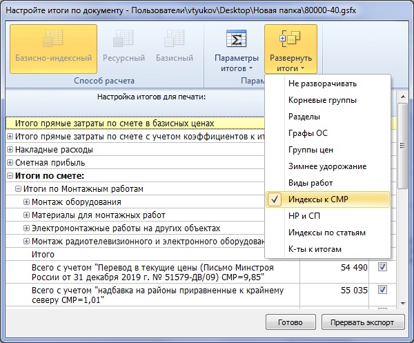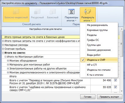 whatman, проверила сейчас на версии 2019 (9.1.8), установлена на WIN10, всё вывело и раскрыло корректно, даже с учетом объединения файлов. Версия 2018 (хоть на WIN10, хоть на WIN7 PRO) сохраняет настройки вывода только для первой сметы