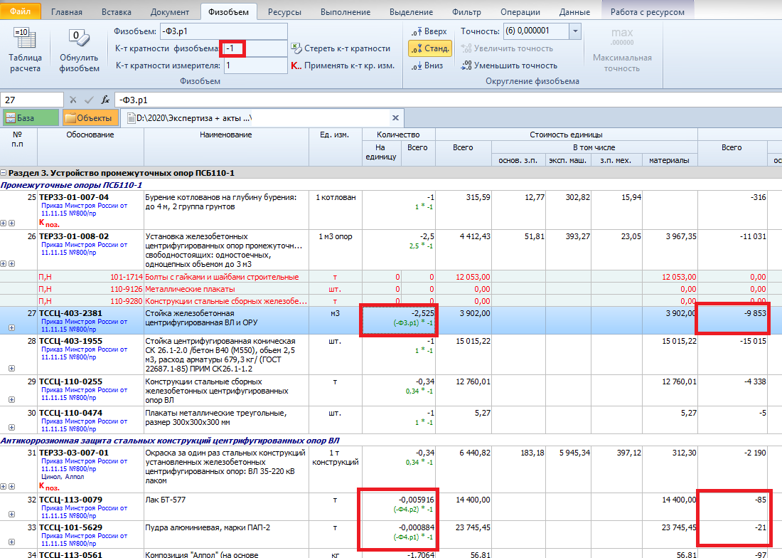 Вычитаемые при замене ресурсы из расценок в изначальной смете идут с отрицательным значением по типу (-Ф2.р1)