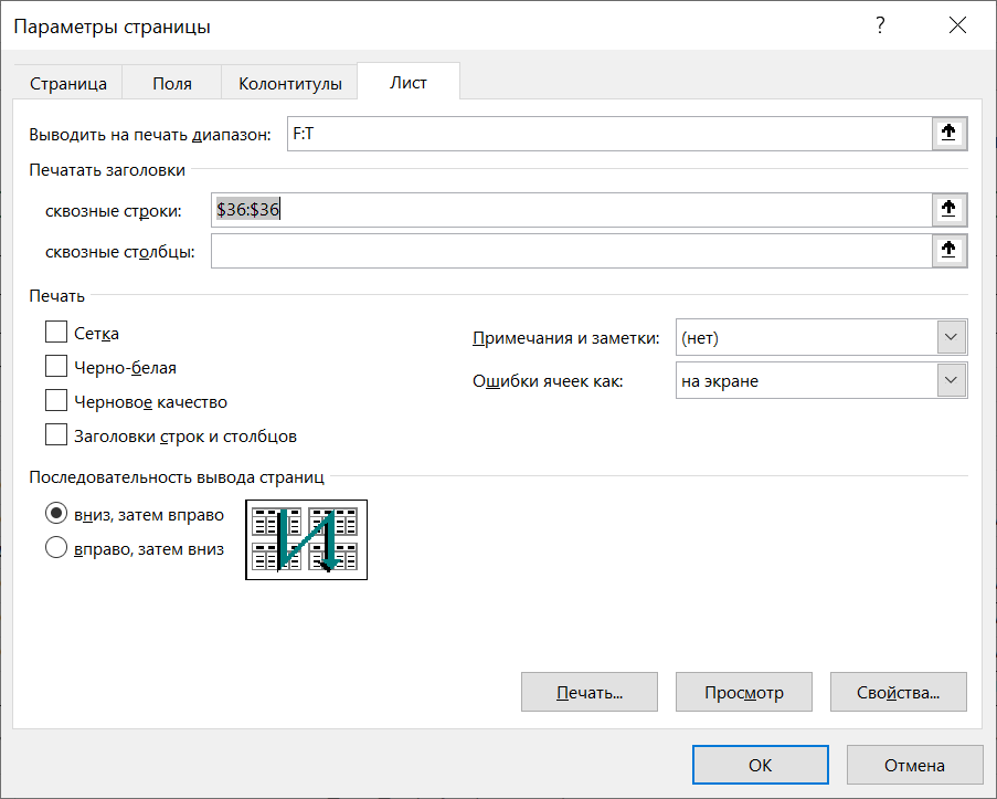Мы в своих шаблонах выходных форм точно ничего менять не собираемся. А вы при желании можете сами удалить или исправить данную настройку у себя в полученном файле Excel (вкладка «Лист» в окне с параметрами страницы):