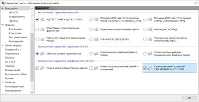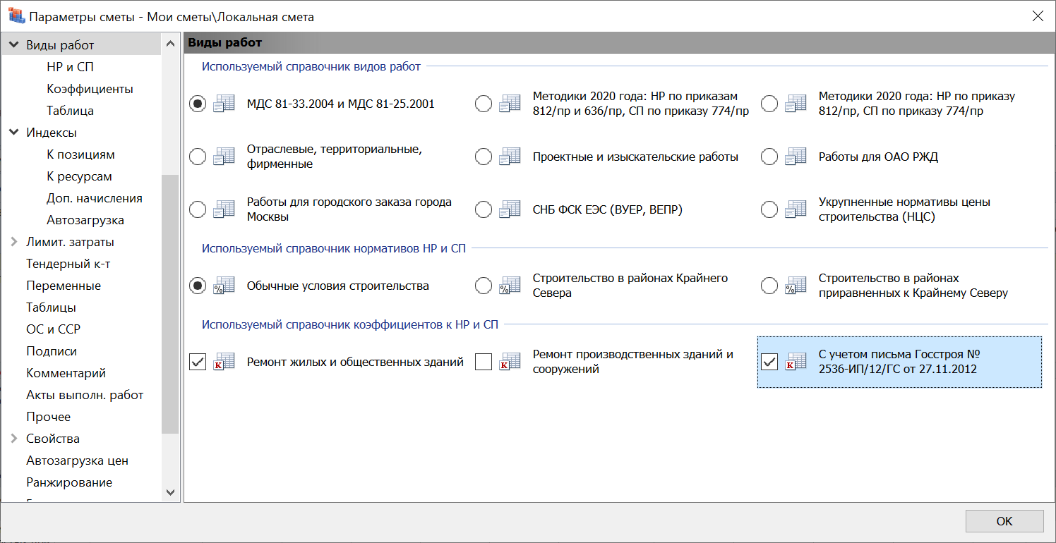 Такая возможность в программе предусмотрена, и она избирательно открыта для тех настроек, которые действительно могут применяться совместно. Например, если выбран справочник видов работ по МДС 81-33.2004 и МДС 81-25.2001, то флажок для письма Госстроя от 27.11.2012 можно поставить совместно с флажком для одного или другого ремонта. Но два вида ремонта одновременно выбрать нельзя, по понятным причинам. А при выбранном справочнике видов работ по Методикам 2020 года ни один из четырёх вариантов справочника коэффициентов к НР и СП не может применяться совместно с каким-то иным.