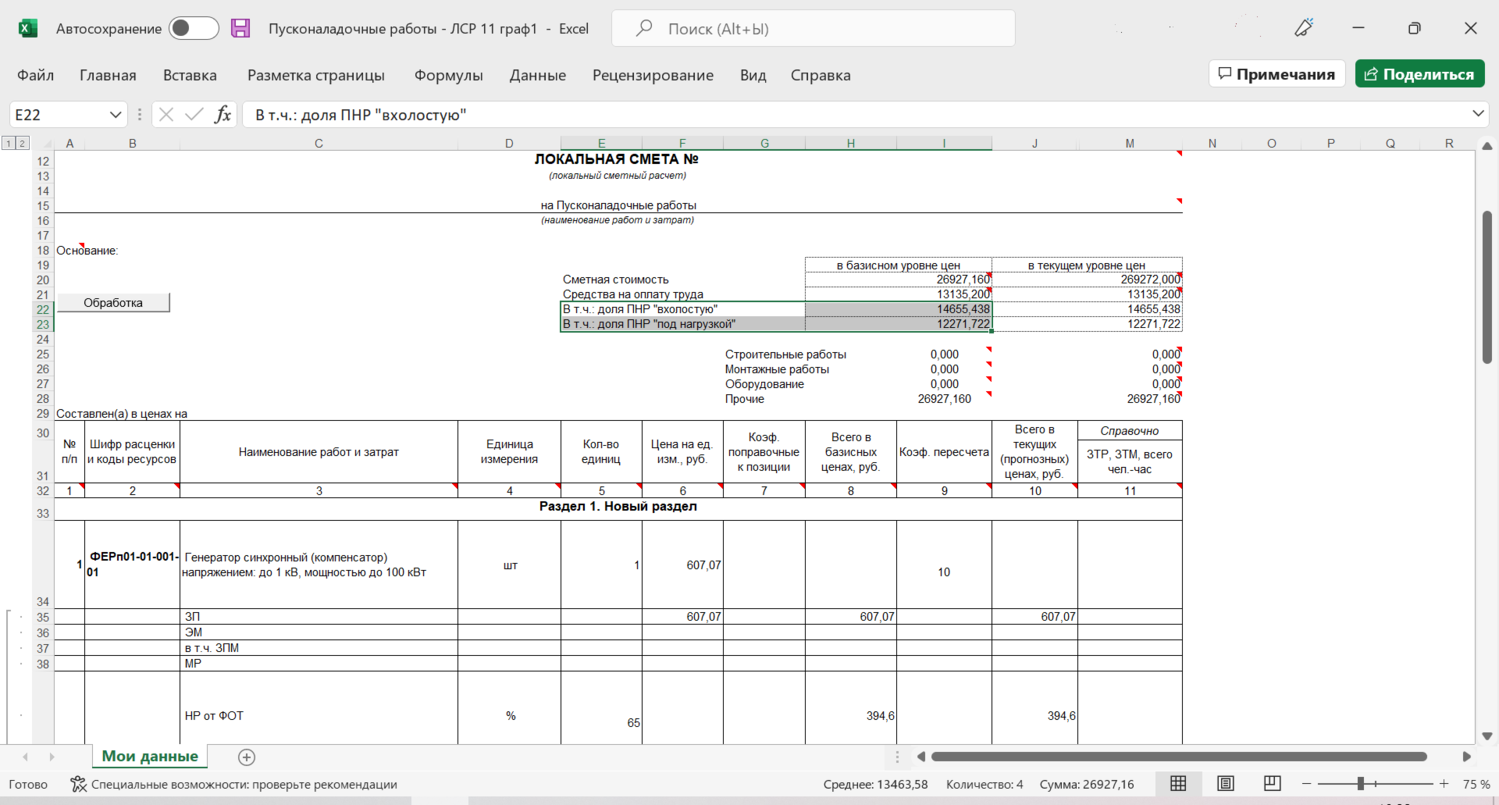«ЛСР 11 граф»), где после нажатия кнопки «Обработка» стоимость прекрасно разбивается на доли «вхолостую» и «под нагрузкой»