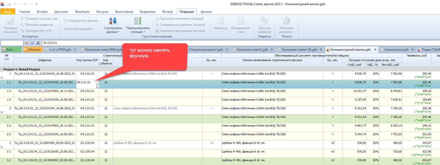 Добавлено (29.12.2022, 10:10) --------------------------------------------- В Конъюнктурным анализе очень не хватает возможности корректировать код группы КСР в самом документе (не заходя в "сформировать шифр ресурса"), как в формировании шифра ресурса