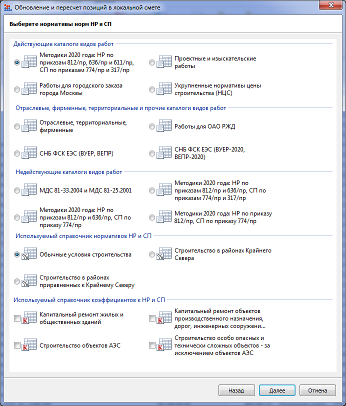 + При массовом пересчёте смет было бы удобно наличие галочки "Не менять" для "Используемый справочник нормативов НР и СП". (Сейчас на руках проект где есть и Центральные районы, и РКС, и МПРКС; вот и приходится следить чтобы при пересчётах (базы который раз с начала года меняют) справочники не слетали).