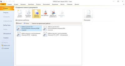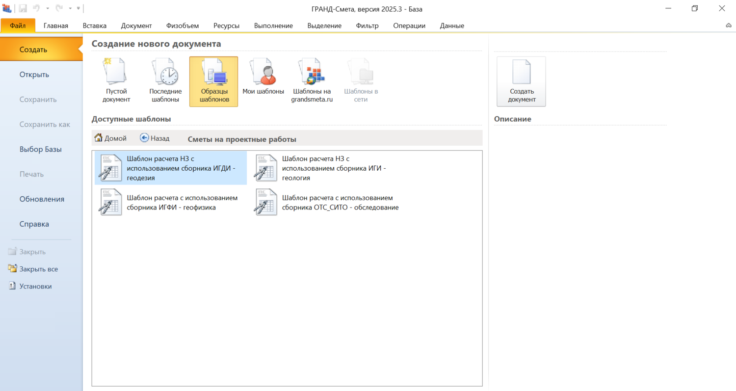 Domino, для каждого из сборников (НЗ_ИГДИ, НЗ_ИГИ, НЗ_ИГФИ, НЗ_ОТС_СИТО) подготовлен шаблон (типовая смета) для расчёта стоимости изыскательских работ с учётом дополнительных затрат. Шаблоны доступны в программе «ГРАНД-Смета» в режиме «Создать» (пункт в меню вкладки «Файл» на панели инструментов) в разделе «Образцы шаблонов», папка «Сметы на проектные работы». Здесь можно открыть шаблон и далее на основании этого шаблона сформировать нужный вам сметный расчёт. В шаблон добавлены заголовки и комментарии с описанием необходимых действий. В позициях заданы расчётные формулы с использованием переменных, полный список переменных можно увидеть в параметрах сметы (подраздел «Переменные» в составе раздела «Свойства»).