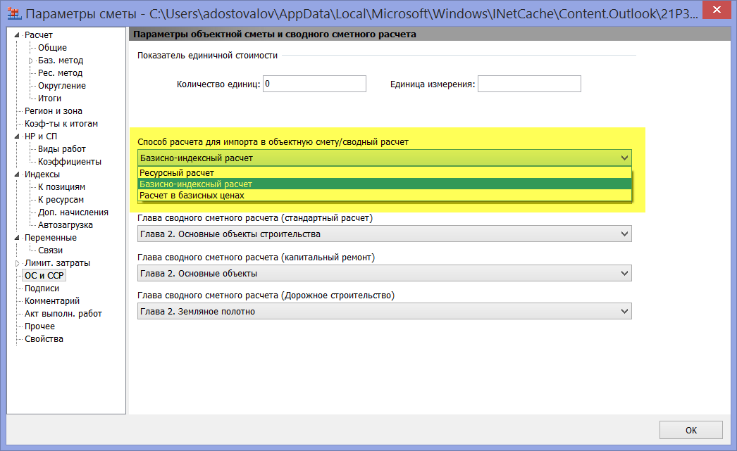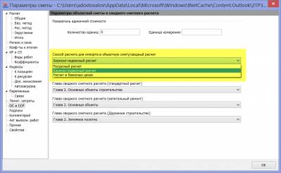 такой настройки просто нет в программе! Разработчики, отвечая на вопрос, по-моему просто Вас не поняли. Любую смету можно считать двумя методами: базисным (возможно и с применением индексов) и ресурсным (непосредственно в текущих ценах). Опции, которая бы запоминала за сметой преимущественный метод расчёта просто нет. То что предлагают разработчики: это открытие всех смет, по умолчанию, либо в текущих ценах, либо в базисных.