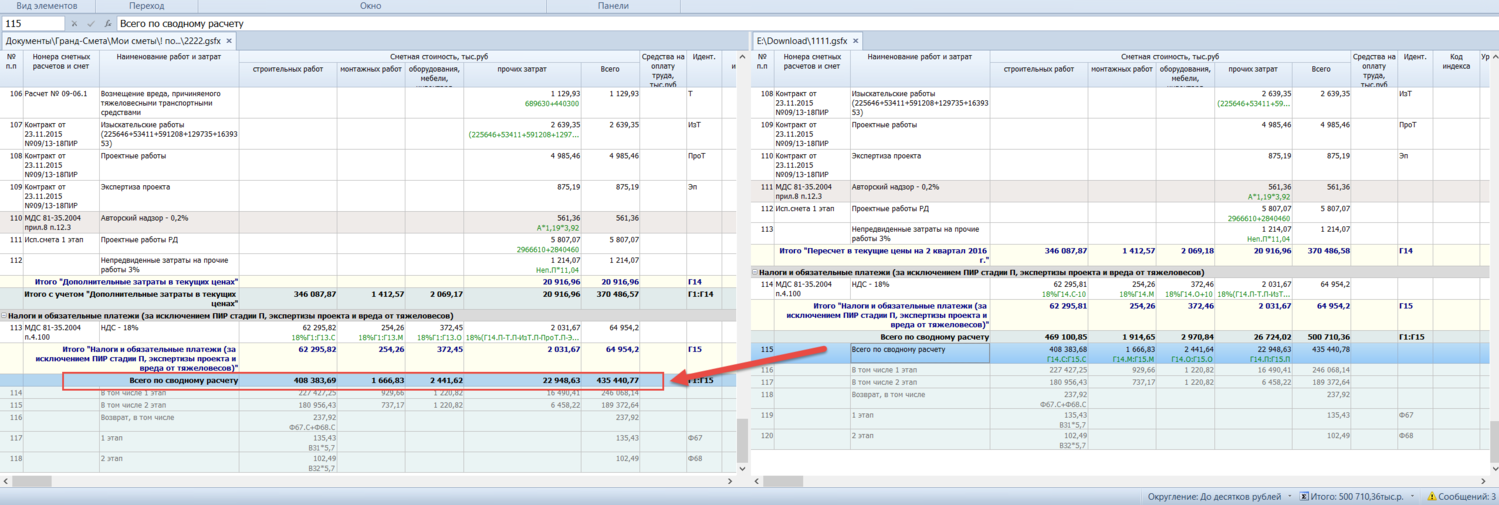 по поводу пустых строк после итогов по главе, либо сумме глав - подумаем. может даже в 7.3 успеем добавить... по аналогии со строками после строки "Всего по сводному расчету", т.е. строк, не участвующих в расчетах, а чисто информационных. тогда у вас все на 100% сойдется с идеальным вариантом... т.е. в Excel ничего править не придется.