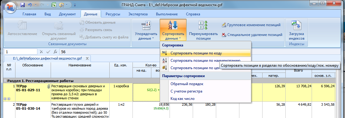 сложение (суммирование) одинаковых позицей в ГРАНД-смтета.