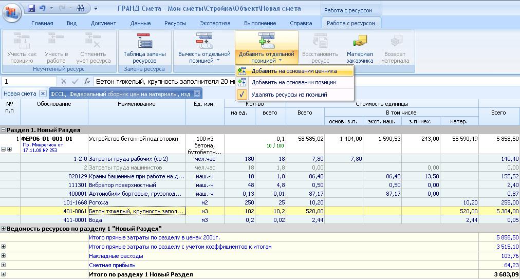 Кстати, если бывает такое, что материал заложен в ресурсной части расценки, но удобнее работать с ним в смете как с отдельной позицией – в «ГРАНД-Смете» для этого специальная функция предусмотрена, чтобы одним действием убрать материал из расценки и добавить следом новую позицию сразу с нужным обоснованием и объемом: