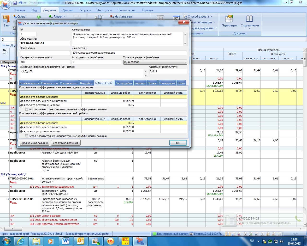в коэффицентах к итогам у меня стоят только индексы по "Письмо Департамента строительства Краснодарского края № 67-882/13-01-06 от 07.03.2013г. (1кв. 2013г)" в графах ОЗП, ЭМ, МАТ. и второй по "Письмо Департамента строительства Краснодарского края № 67-882/13-01-06 от 07.03.2013г. (1кв. 2013г. Пусконаладочные работы) " только ПЗ. галочка внизу"учитывать при подведении итогов". а что касается НР с СП, они проставлены в доп информации в коэффициентах, для видов работ, там же и умножены на 0,9 и на 0,8. может не там их умножила, просто в параметрах коэффициенты для НР и СП я не заполняла