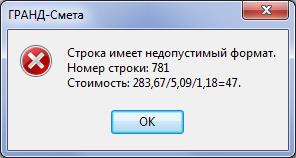 --------------------------- ГРАНД-Смета --------------------------- Строка имеет недопустимый формат. Номер строки: 781 Стоимость: 283,67/5,09/1,18=47. --------------------------- OK ---------------------------