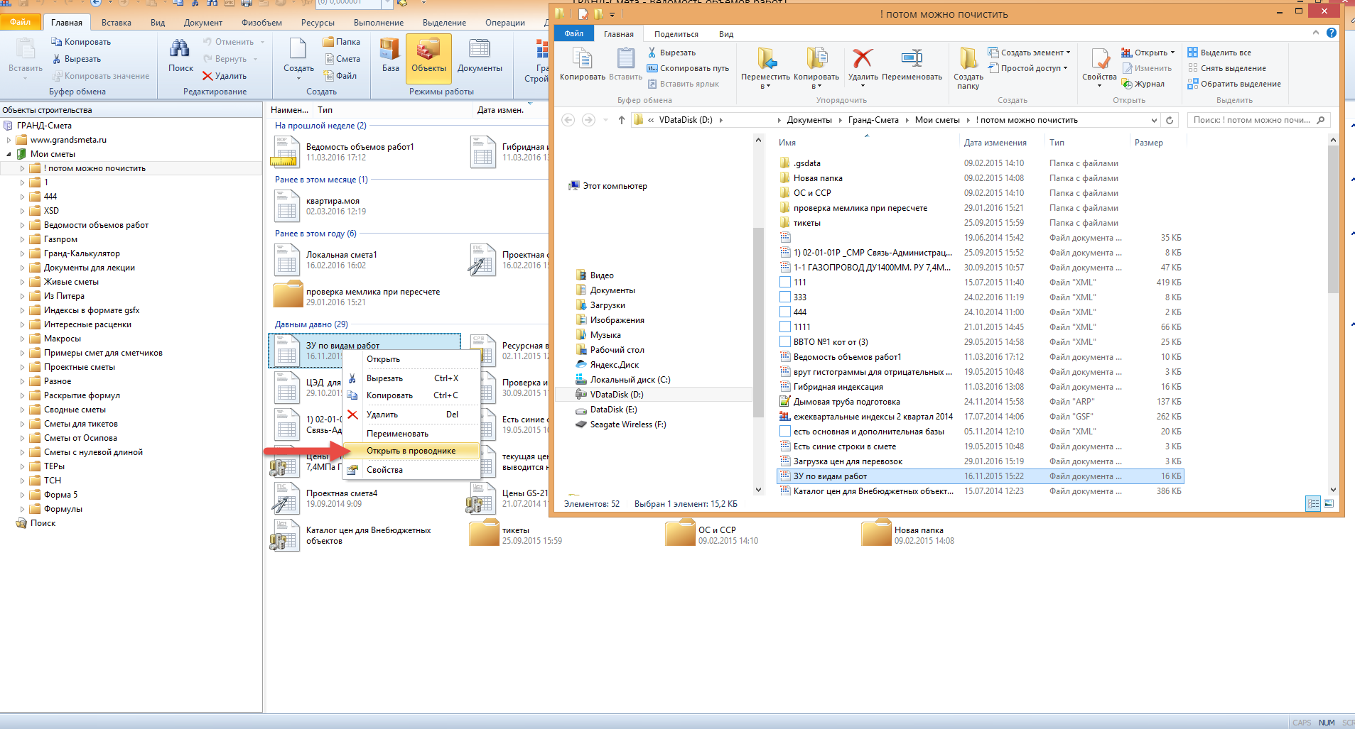 Судя по вашим скриншотам, версия у вас очень старая, которая хранит все сметы в одном файле userdb. Уже давно (начиная с версии 6), все сметы хранятся в виде обычных файлов на диске в папке Мои документы. Открыть же папку с файлом можно выбрав соответствующую команду из контекстного меню: