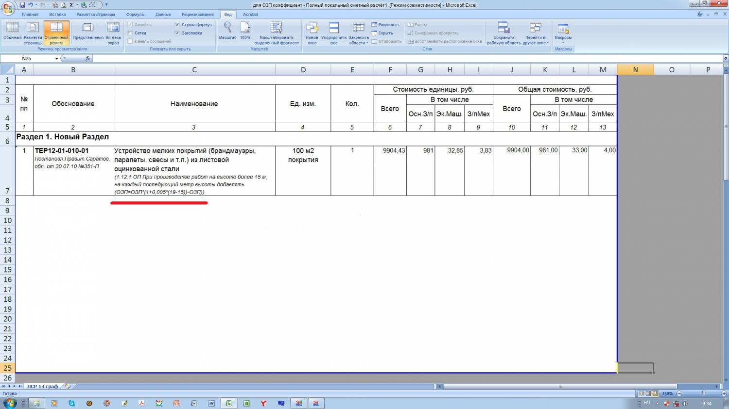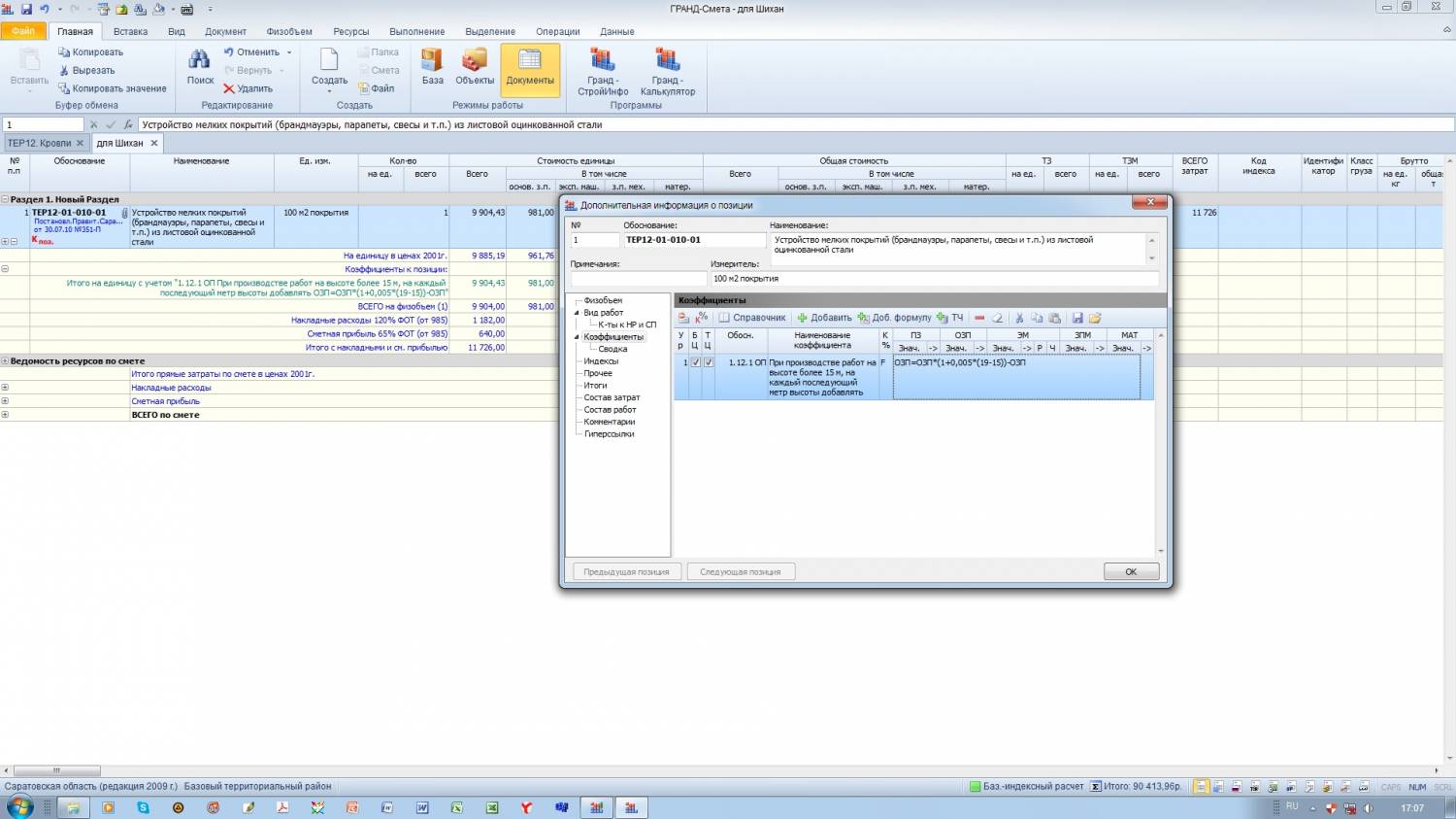 Устройство мелких покрытий (брандмауэры, парапеты, свесы и т.п.) из листовой оцинкованной стали (100 м2 покрытия) (ОП п.1.12.1 При производстве работ на высоте более 15 м, на каждый последующий метр высоты добавлять ОЗП = 1881,8*(1+0,005*(19-15))-1881,8; МДС35-IV п.4.7.При ремонте и реконструкции зданий и сооружений работы, аналогичные технологическим процессам в новом строительстве ОЗП=1,15; ЭМ=1,25 к расх.; ЗПМ=1,25; ТЗ=1,15; ТЗМ=1,25; Гаррик, у меня вот так выводится. Т.е. прописывается значение ОЗП. Наверное, где-то галочку надо поставить