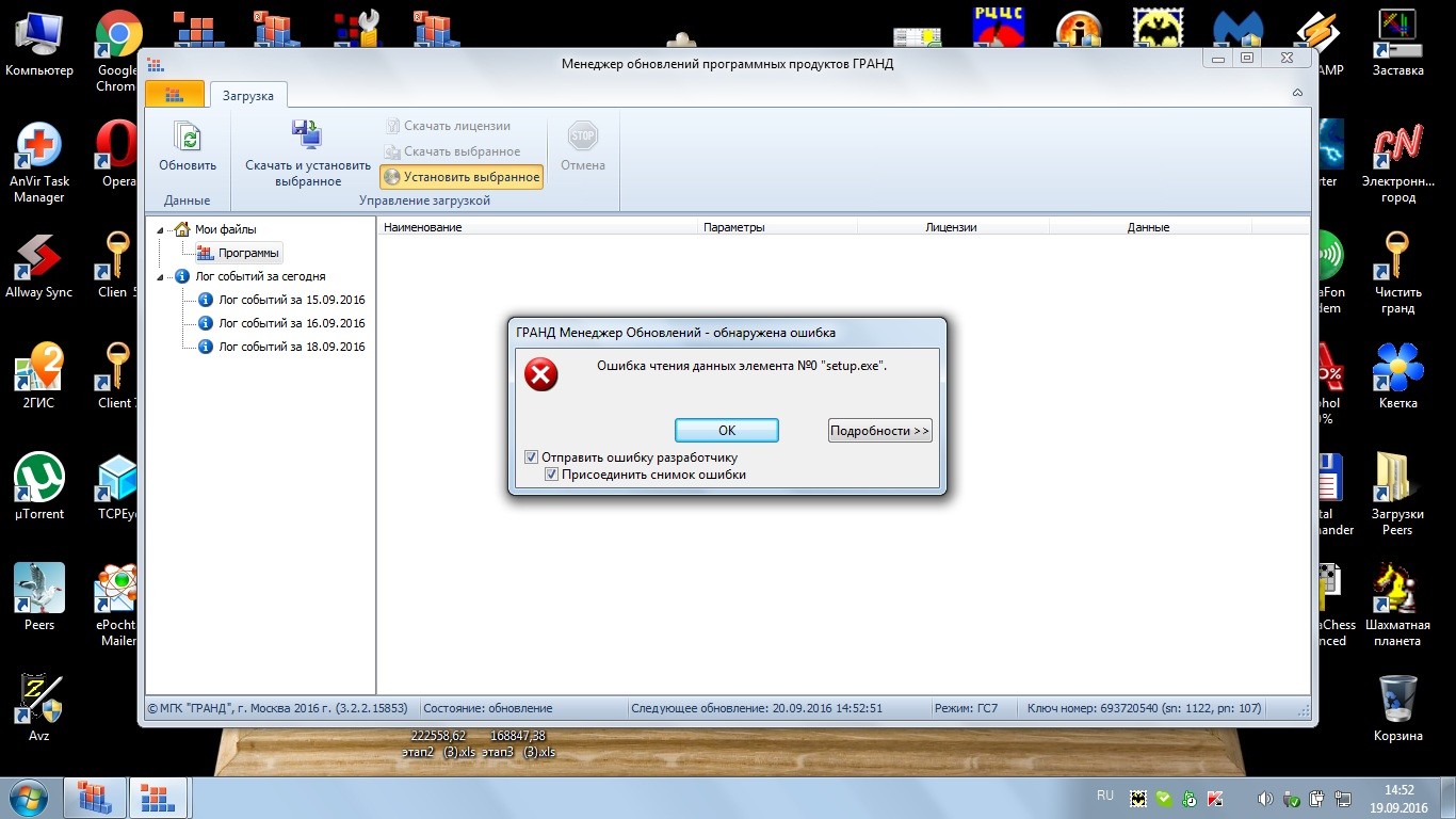Вот отсюда скачать и установить в ручную http://update.grandsmeta.ru Проблема как рукой снимается! У меня еще самостоятельно менеджер обновлений ни разу не обновился! )))