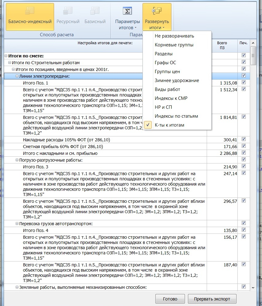 Я так тоже пробовала,при этом  при экспорте настраивала Итоги в конце документа - с настройкой вида итогов.(Мне же нужно мои коэффициенты в смете пояснить).И там выбираю Развернуть итоги - К-ты к итогам. По разделам и правда компактно все, но в конце сметы на 10 страниц прописываются коэффициенты по каждой позиции((