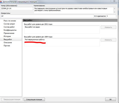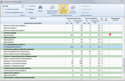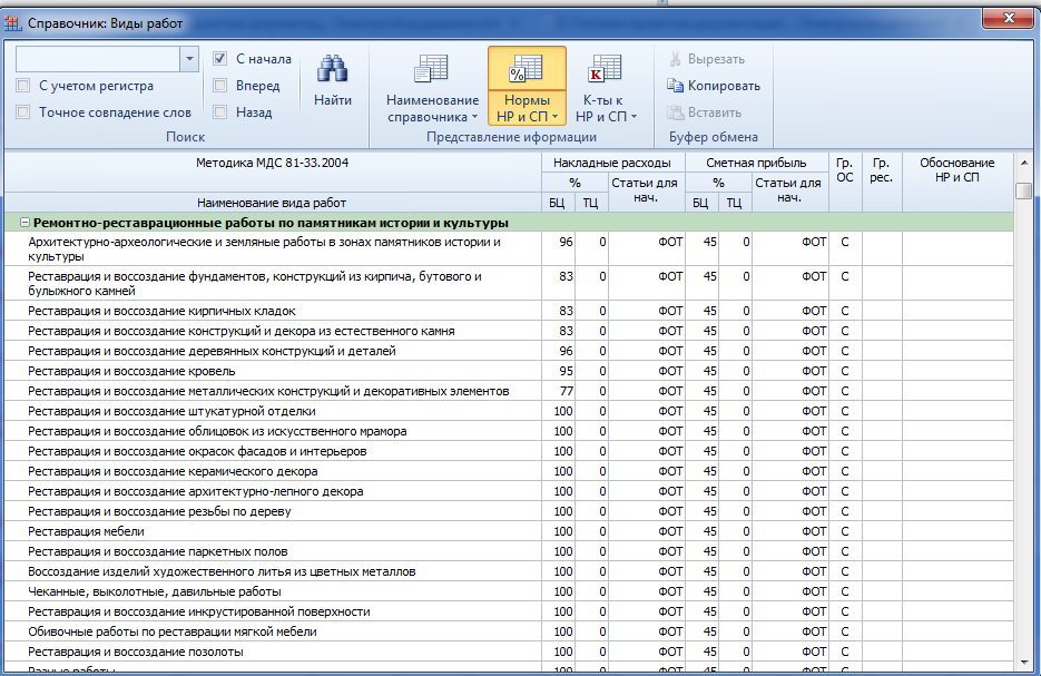 Что касается списка видов работ для расценок 1984 года, он всегда был таким - можно заметить, что там и для большинства общестроительных работ один общий определитель, и для ремонтных. В том числе, и для всех реставрационных работ даётся одно общее значение НР и СП. Такова особенность базы 1984 года - не знаю, где и когда вы видели что-то иное.