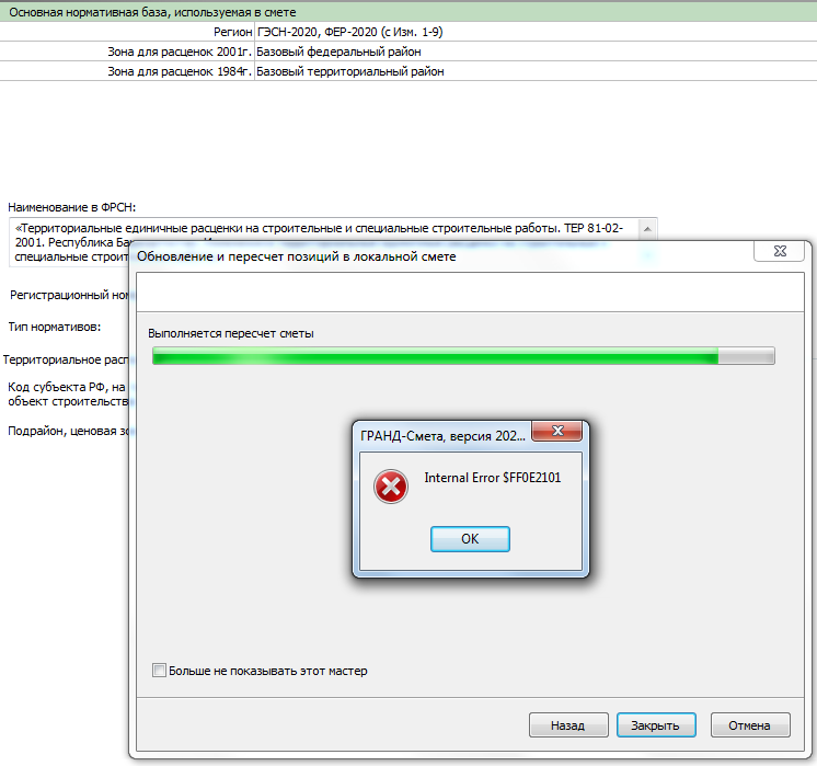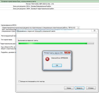 четыре раза пытаюсь пересчитать смету и 4 раза вылезает ошибка. в чем проблема может быть? версия программы последняя обновилась сегодня. файл прислали со стороны.