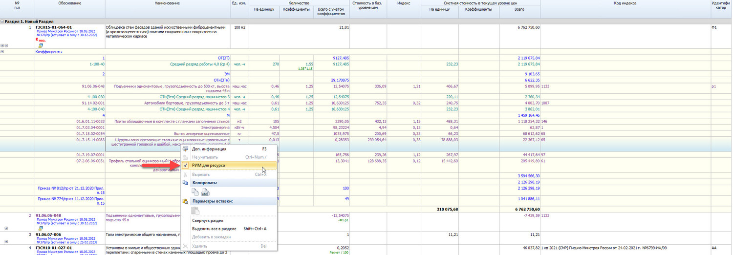 Текущая цена рассчитывается перемножением базисной цены на индекс для ресурсов с включённой настройкой «РИМ для ресурса» – эта настройка присутствует в контекстном меню ресурса.