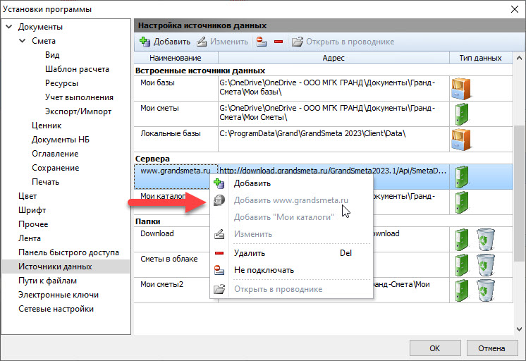меню Файл-Установки-Источники данных. далее ПКМ и из контекстного меню выбираете Добавить www.grandsmeta.ru