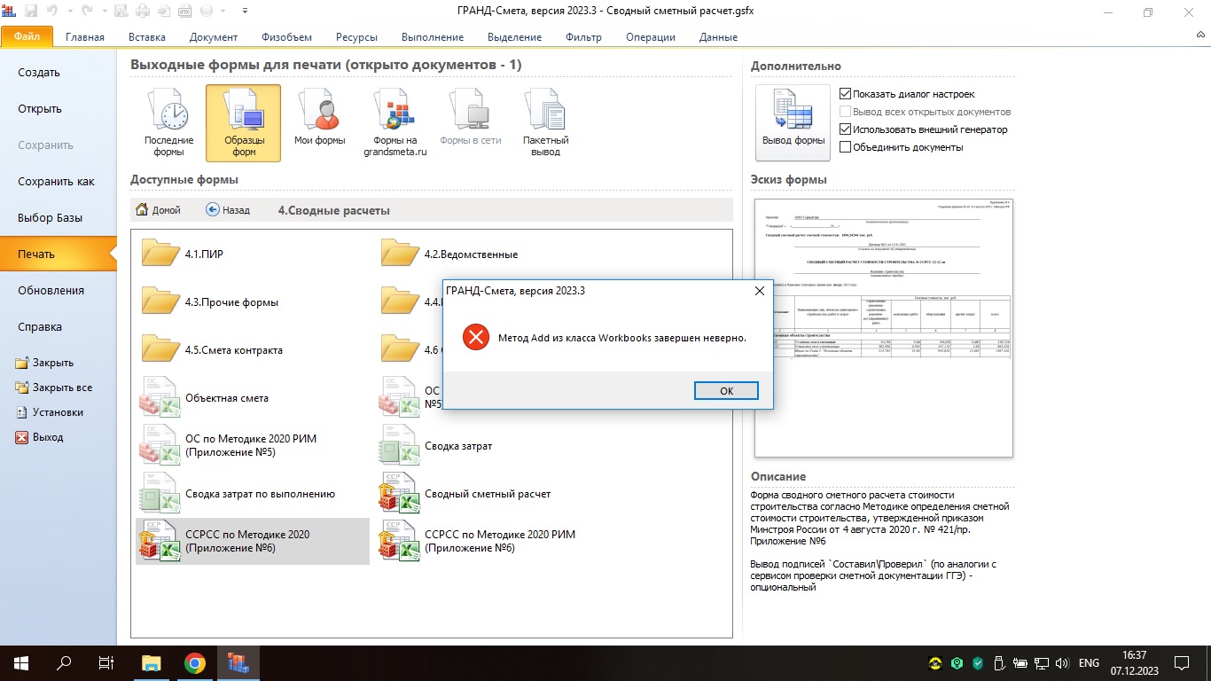 У меня на компьютере этот файл без проблем выводится в Excel (то есть, формируется с опцией использования внешнего генератора) - именно в выходную форму ССРСС по Методике 2020 (Приложение № 6).
