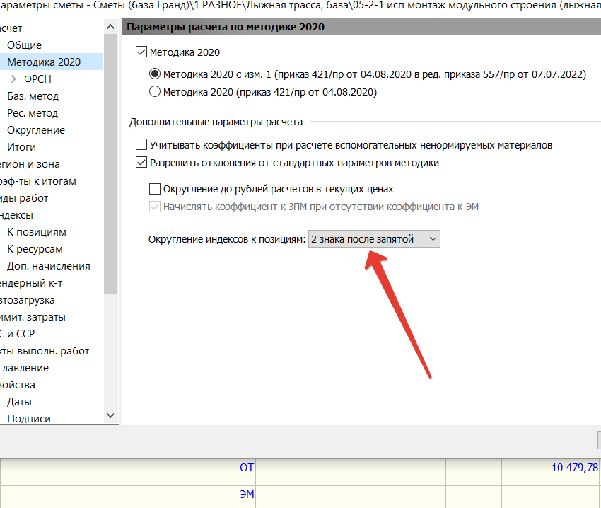 В параметрах приложенной сметы показывает, что шаблон расчета не определен. Выбираем шаблон для ресурсно-индексного метода и все округляет, как надо.