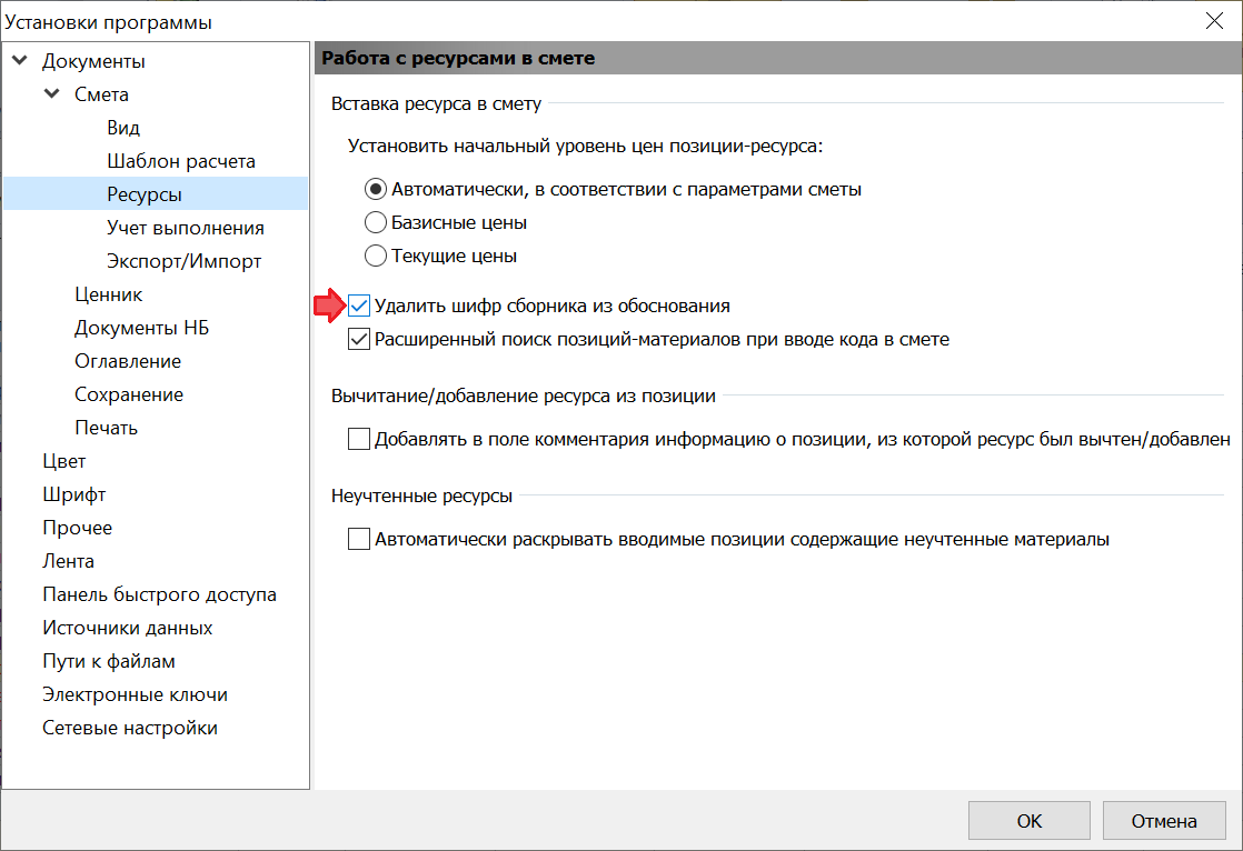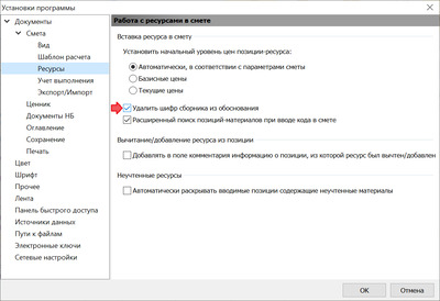Вы можете настроить программу таким образом, чтобы при добавлении в смету материала из ФССЦ шифр сборника не указывался в обосновании материала: