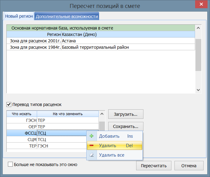 в диалоге пересчета в таблице с шифрами оставьте только те, которые надо менять. уберите из него тсц и т.п.