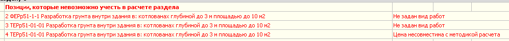qwer0361, и что там внизу написано? Почему невозможно учесть позиции в расчете? Может не задали вид работ, может цена не соответствует методу расчета, может ещё что-то...