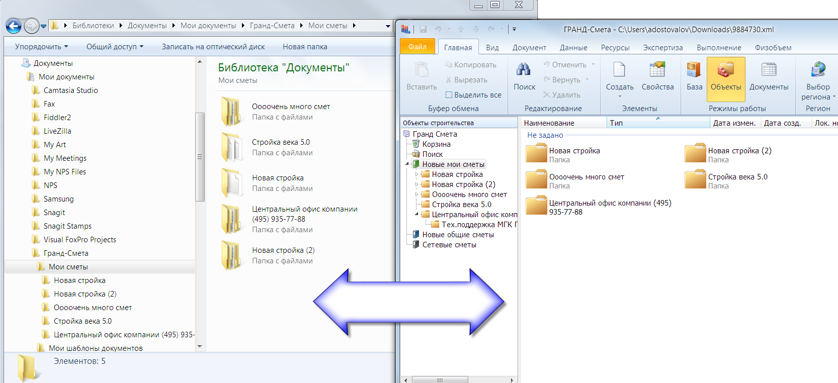 в версии 6 полностью переделан движок работы с данными. файла UserDb.gsd больше нет. все сметы хранятся в обычных файлах внутри Мои документы (больше нет ограничений по вложенности и т.п.)... +вы можете вообще хранить сметы где нибудь в "облаке", скажем на яндекс.диске и иметь к ним доступ с любого места. +переписан сервер сметы - увеличена его производительность. +шаблоны смет и выходных форм можно использовать не только локальные, но и с интернета. для совсем крупных клиентов - сметы можно хранить на SharePoint. +изменен внутренний формат файла на открытый gsfx.