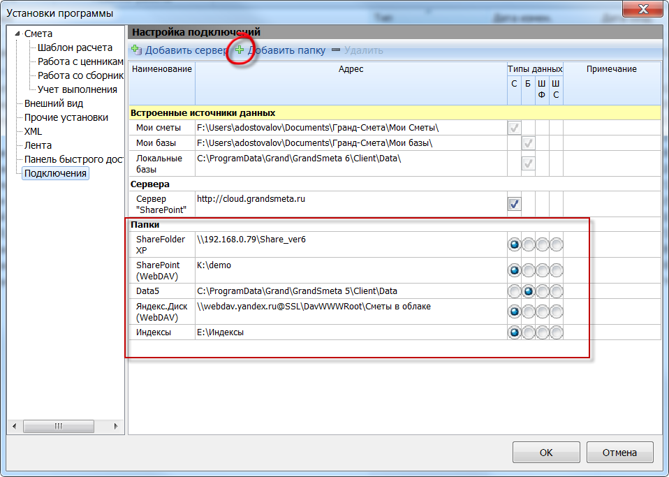 в вашем случае - добавьте еще один источник со сметами. назовите его Сетевые сметы и укажите ваш путь к данным. можно указать через имя диска T:\., но лучше путь указывать через имя ПК, например, \\Server1\Share
