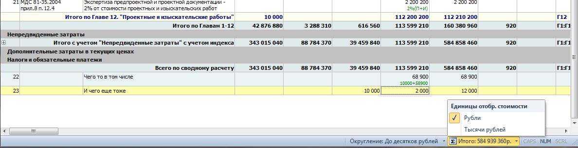 Добавлено (24.07.2013, 09:12) --------------------------------------------- и еще - вот о чем давно "просил":D - правда, этого не обещали сделать - просто приняли на заметку - но актуальная функция - в объектном и сводном в правом нижнем углу есть возможность поменять округление - желательно добавить "единицы отображения стоимости"- рубли или тыс. руб. - чтобы так же как и с округлением - не лезть в параметры