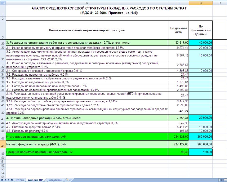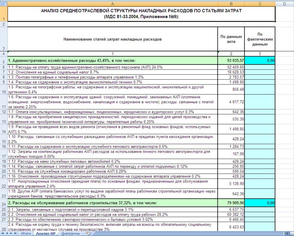 Первоначально формируется простая таблица Excel именно с теми данными, которые отображаются в окне с итогами. В левом верхнем углу таблицы находится кнопка «Анализ итогов». И при нажатии кнопки «Анализ итогов» в документ добавляются два дополнительных листа: лист «Диаграммы», где предлагается графическое представление структуры итогов, а также лист «Анализ НР», где общая величина накладных расходов по сметному расчету распределяется по статьям затрат в соответствии со среднеотраслевой структурой накладных расходов, указанной в приложении 9 к МДС 81-33.2004.