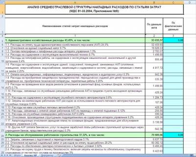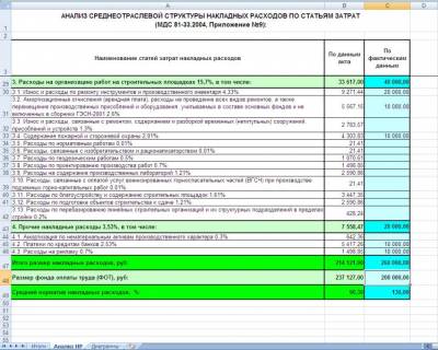 При желании здесь можно вручную ввести в последнюю колонку фактические затраты по соответствующим статьям на основании данных бухгалтерского учета подрядной организации. При этом общая итоговая величина накладных расходов по фактическим затратам получается в конце таблицы автоматически. А если в колонку дополнительно ввести фактическую сумму расходов на оплату труда работников основного производства – также на основании данных бухгалтерского учета – то в последней строке таблицы немедленно появляется фактическая расчетная норма накладных расходов подрядной организации.