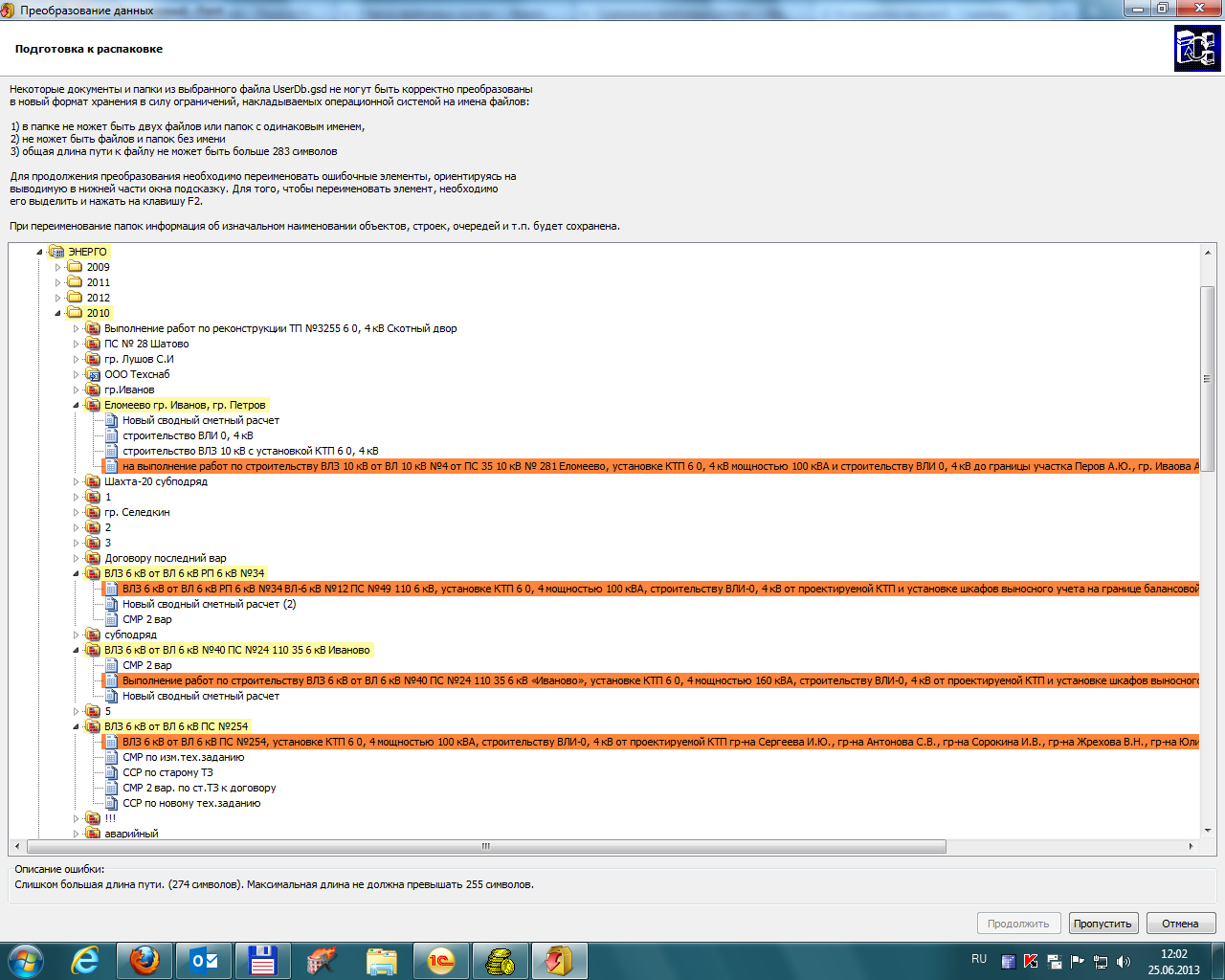 Неправда! Все сметы открываются нормально. Или Вы хотите сказать, что из 3280 смет я не замечаю что 1162 сметы вообще не открываются?! Чтобы не быть голословным посмотрите протокол конвертации. Там именно ошибки СОЗДАНИЯ, т.е. именно из-за ограничений файловой системы утилита не может создать файлы с длинными названиями. Да ё-маё кому я это объясняю, Вы и сами это прекрасно понимаете. Да и смысл мне вообще посылать сюда совершенно другие ошибки, не относящиеся к тематике данного вопроса. Ну и через утилиту repair прогнал эту базу - все с ней в порядке. Скажите, пожалуйста, почему не добавить в эту утилиту конвертации дополнительной функции автоматического переименования? Ведь, по сути, даже при переименовании вручную сидишь и тупо убираешь часть названия сметы...
