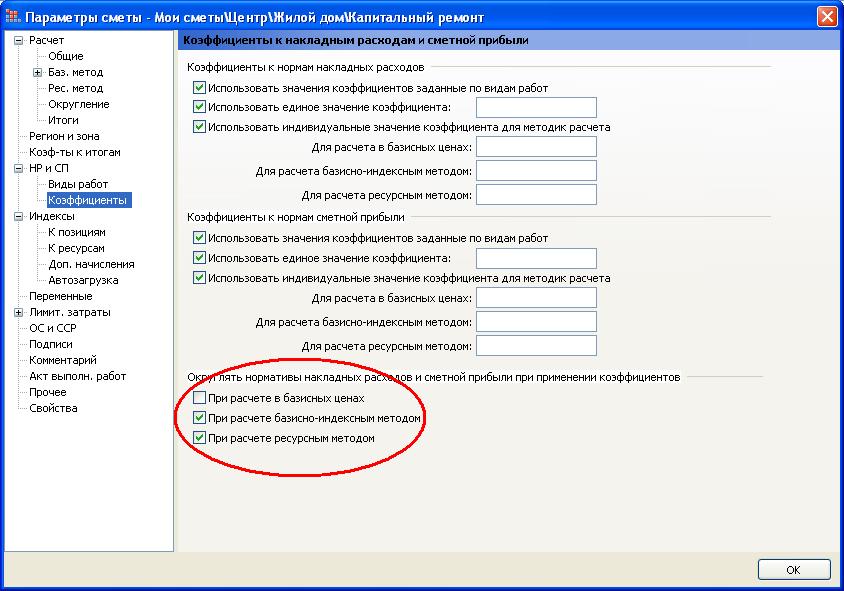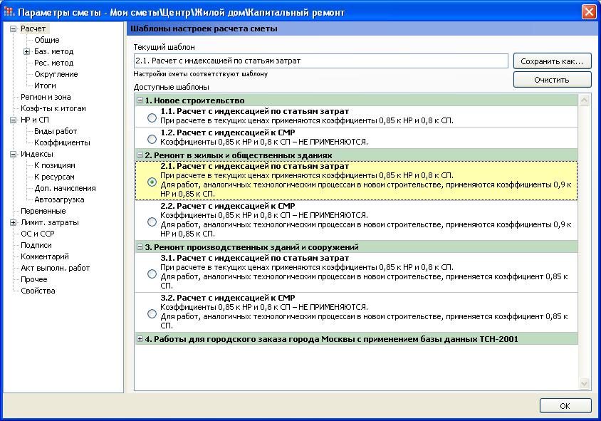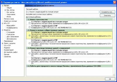 marina32, для того чтобы нормативы НР и СП округлялись до целого числа после применения к ним коэффициентов, в ПК «ГРАНД-Смета» предусмотрена специальная настройка в окне с параметрами сметы на закладке «НР и СП – Коэффициенты»: Добавлю, что работая в ПК «ГРАНД-Смета» версии 6, вы можете одним действием задать целый набор необходимых параметров сметы, в зависимости от вида строительства и применяемых индексов перевода в текущие цены. В том числе, при этом сразу происходит выбор соответствующего справочника видов работ и настройка округления нормативов НР и СП. Для этого необходимо выбрать подходящий шаблон настроек расчета в окне с параметрами сметы на закладке «Расчет»: